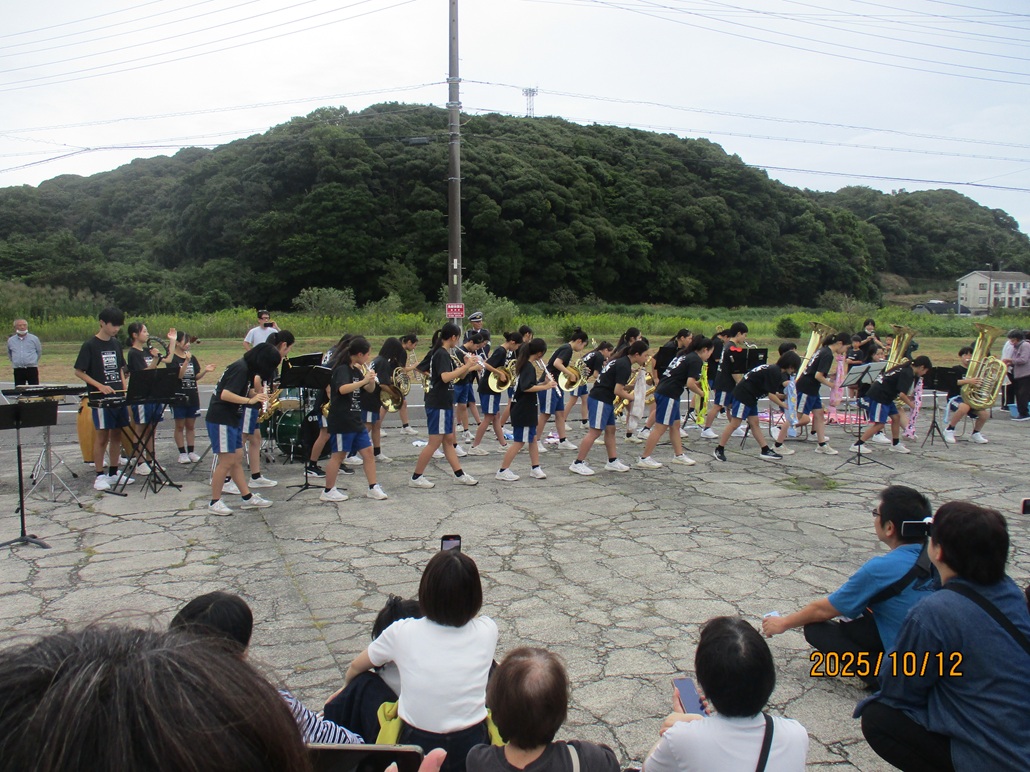 10月12日(日)、吹奏楽部が大江区の「大江公民館まつり」に出演しました。台風による雨が心配されましたが、公民館前で明るく楽しい演奏会を披露しました。