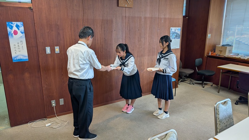 9月30日(火)、全校生徒の手で集められた約2万円の募金を、生徒会長と環境福祉委員長とが市役所に届けに行きました。「復興支援のために大切に使ってください。」と手渡した募金で、少しでも市内の方々が救われることを願っています。そして、牧之原市全体が元気になってくれたらうれしいです。