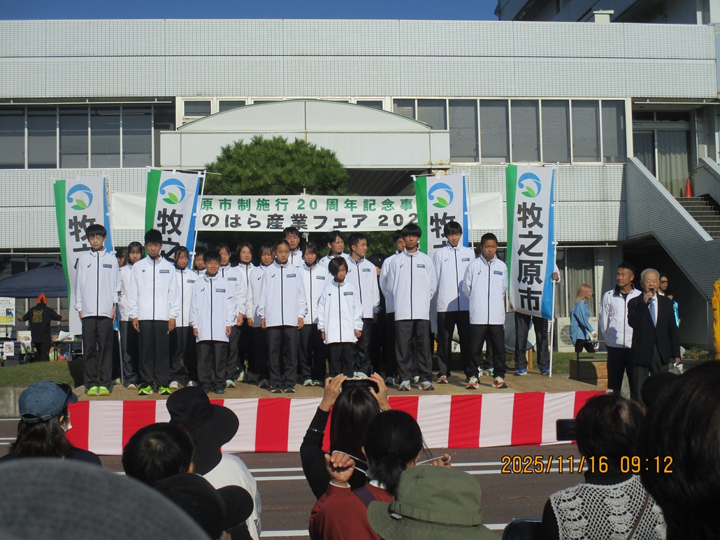 11月16日(日)、小春日和の中、まきのはら産業フェア開会式がありました。その中で、12月に行われる「しずおか市町対抗駅伝」の壮行会が盛大に行われました。本校からもたくさんの子供たちが選ばれています。また、本校卒業生も高校生代表として凛々しくなってステージにあがっていました。