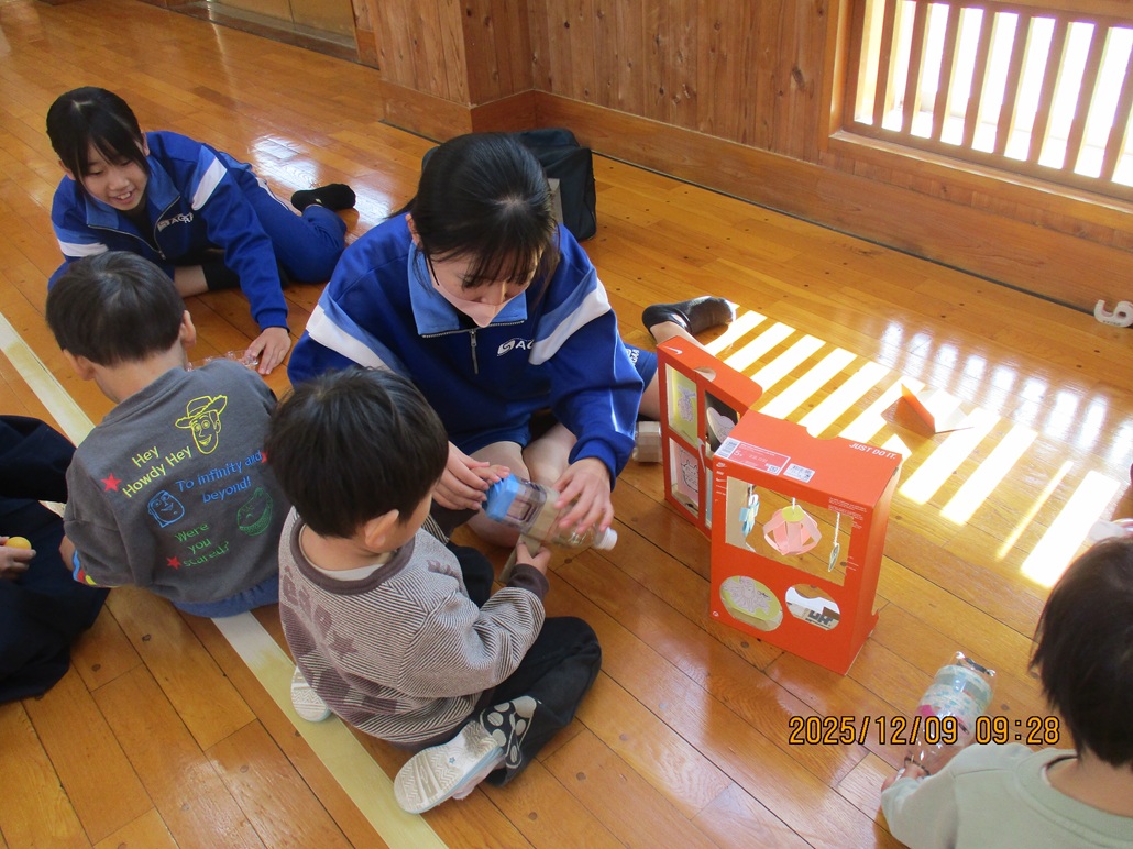 子供たちの作ったおもちゃには、段ボールを使った乗り物やキャタピラ型遊具、折り紙を使ったかわいいお弁当やかっこいい車など、工夫がいっぱい詰まっていました。子供たちは、園児に優しく手を添えてやり方を教えてやったり、うまくできたときには園児とハイタッチをし合ったりと、園児つの触れ合いをとても楽しんでいました。