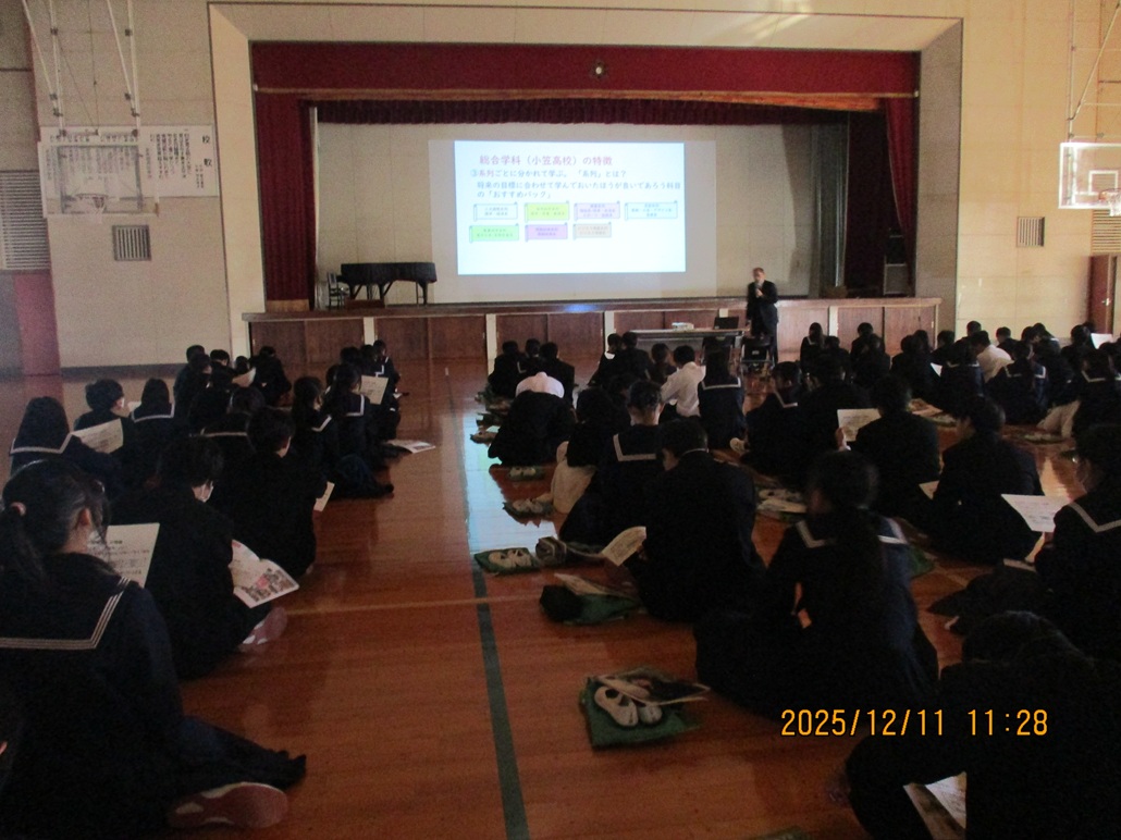 12月11日(木)、2年生総合的な学習の時間で「進路講話」を行いました。今回は小笠高校、キラリ高校といった特色のある高校のお話をうかがいました。