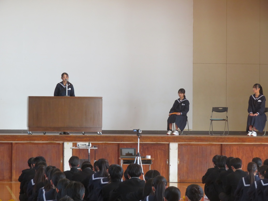 初めに3学期始業式を行いました。各学年の代表生徒からは、「勉強に、部活動に、そして学級委員としてがんばりたい」「1年後の進路に向けて『有言実行』で取り組みたい」「卒業までのわずかな時間を大切にしたい」など、一人一人が思いのこもったあいさつを力強く行うことができました。
