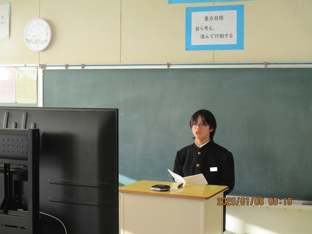 保護者の皆様、地域の皆様、新年明けましておめでとうございます。令和8年1月6日(火)、子供たちの元気な声と笑顔で令和8年相良中学校の教育活動がスタートしました。