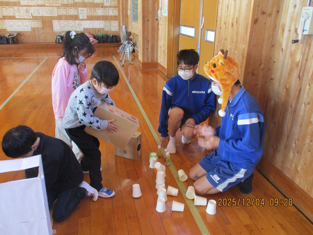 ガチャガチャをイメージしたおもちゃ、磁石を使った釣りゲーム、バネやカップを使った的宛ゲームなど、園児の興味を引くおもちゃがいっぱいでした。園児のみんなは、お兄さん、お姉さんと触れ合うだけでも楽しいのに、更にワクワクするおもちゃに1時間じゅうはしゃぎっぱなしでした。中学生のみんなも、教室では見せないような優しい目こぼれる笑顔で園児を包み込んでいました。
