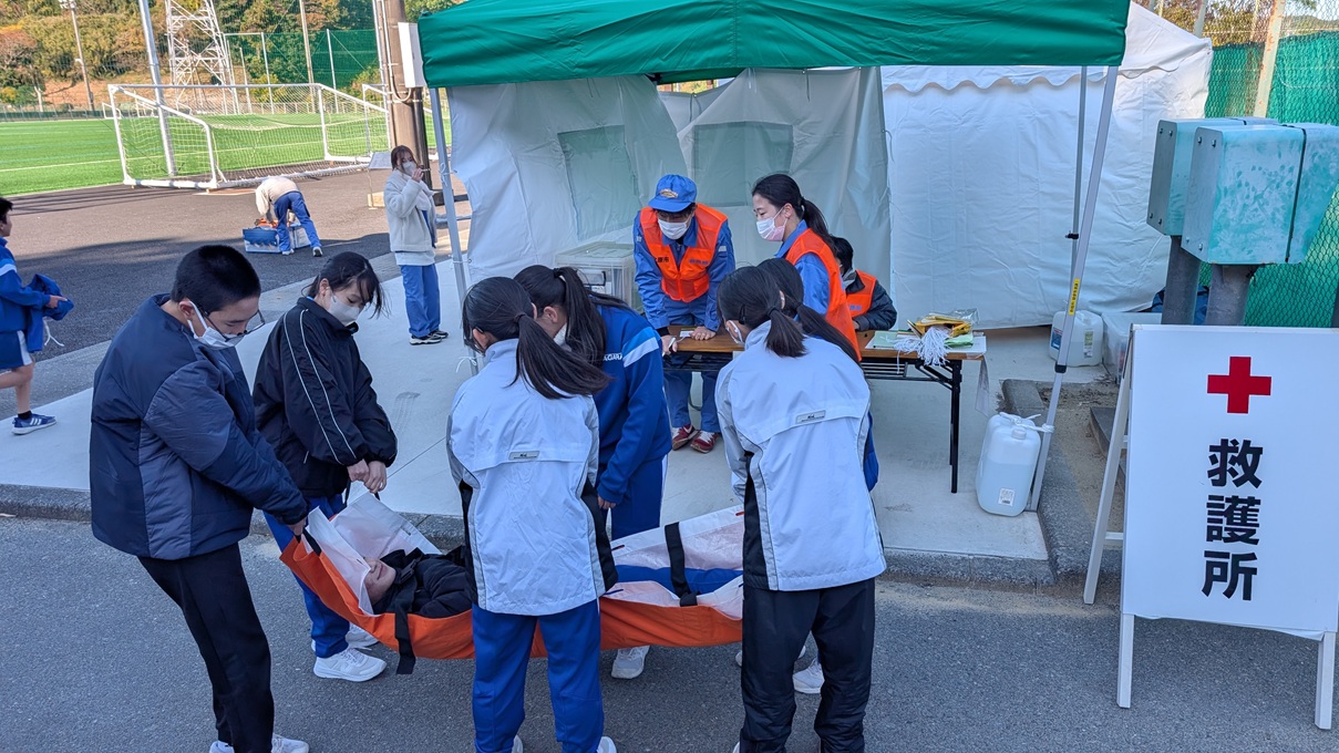 また今回は、総合グラウンドで役場の方々との「救護訓練」も行われました。担架によるケガ人の搬送など、中学生でもできる救護活動について体験し、子供たちは真剣に話を聞いたりケガ人に配慮しながら搬送活動を行ったりと一生懸命に活動できました。